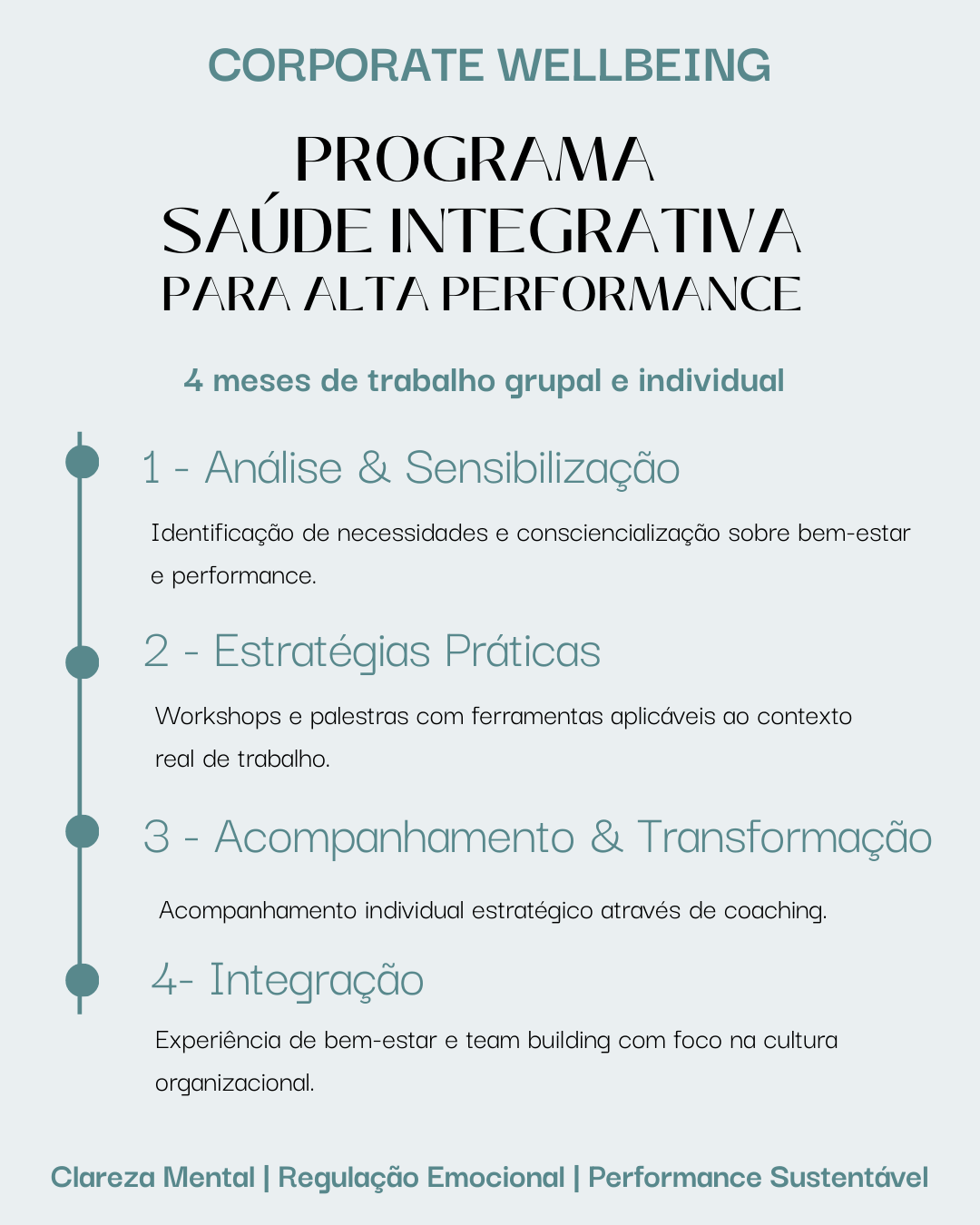 O bem-estar corporativo vai além da saúde mental. Para criar equipas verdadeiramente resilientes e produtivas, abordamos a saúde de forma integrativa: física, mental, emocional e espiritual.